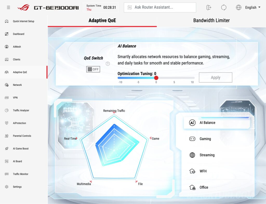 By default, the router runs an “AI Balance” profile. It acts like a traffic police, dynamically slicing up your bandwidth pie to ensure rogue background downloads or greedy applications don’t choke the rest of the network. If you need it to be more specialized, you can customize it into profiles like the Gaming or Office modes to strictly prioritize those specific workloads.