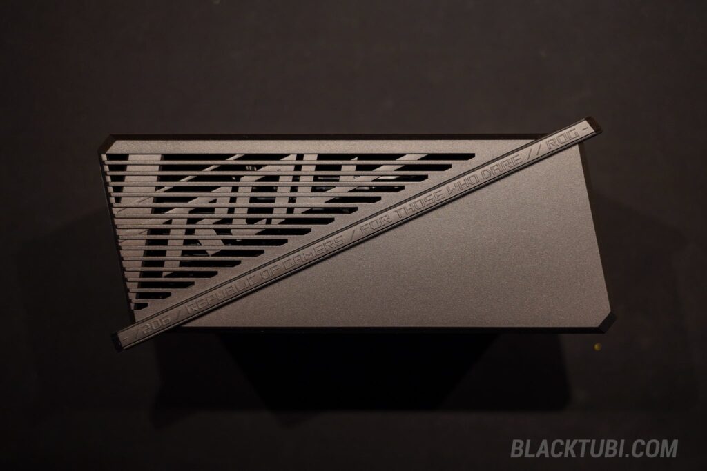 The ROG Strix GS-BE18000 features the “Slash” design just like the ROG Strix GS-BE7200X, and honestly, it’s beautiful. It’s slightly heavier than the GS-BE7200X, feeling incredibly dense and premium. The thermal solution inside uses carbon-nano-coated heat plates, a necessary addition to tame the powerful Broadcom Quad-Core chip inside.