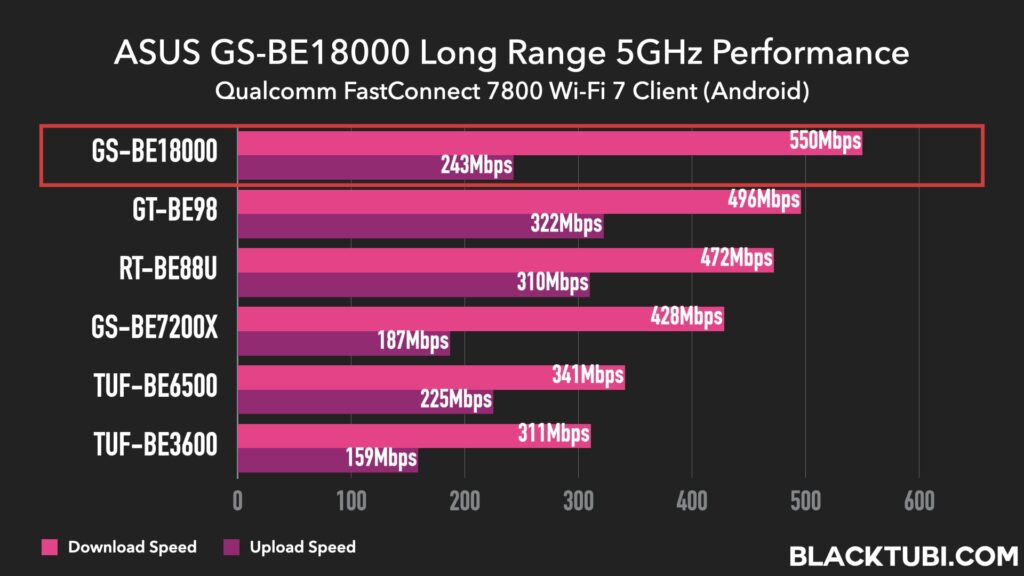 The biggest surprise came in our long range 5GHz test. The GS-BE18000 actually seems to outperform both the GT-BE98 and RT-BE88U in our long range scenario. It seems the unique internal antenna design provides exceptionally focused coverage, delivering one of the fastest long-range speeds we’ve ever recorded.