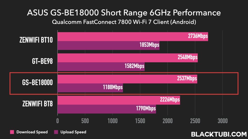 In our short-range 5GHz tests, the GS-BE18000 is excellent, exceeding the performance of most ASUS routers we have tested, with the exception of the ultra-flagship ROG Rapture GT-BE98 and RT-BE88U. That said, the difference at this high level is marginal and barely noticeable in real-world usage.