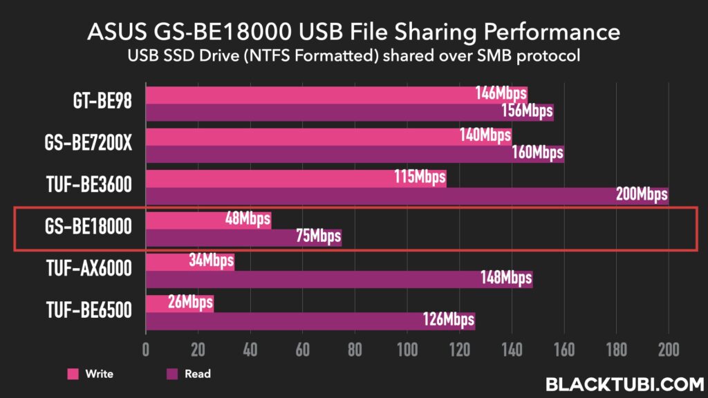 Unfortunately, the USB file sharing performance on the GS-BE18000 is slower here. It seems that this model might not be fully optimized for storage tasks, as the product focus was clearly placed on gaming. It is evident that gaming stability and network consistency were the absolute priorities here, rather than trying to make the router double as a high-speed NAS.