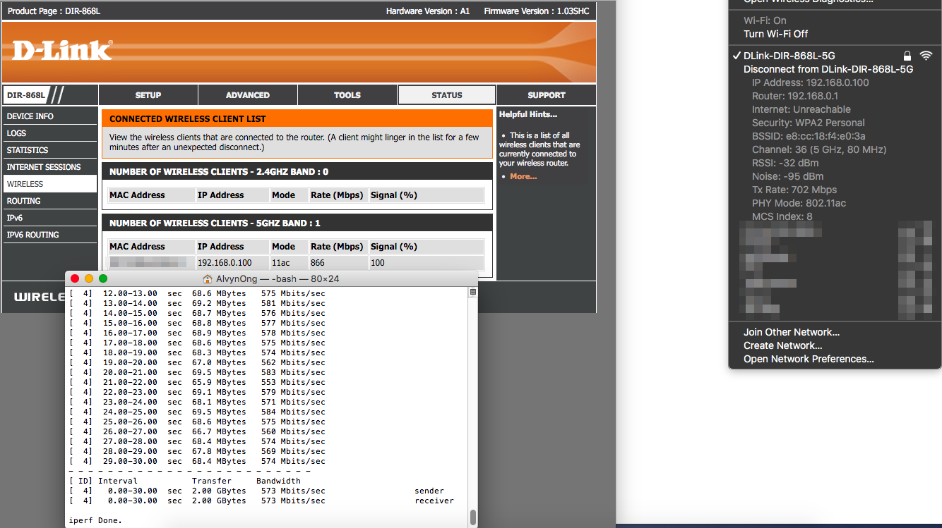 D-Link DIR-868L perform really well on my wireless test. Despite this is no longer a new product in the market, the performance is still pretty decent. I manage to achieve 573Mbit/s on my usual iPerf test. The signal strength of this router is good despite the unconventional no external antenna design. 5Ghz is surprisingly good on this router. Other routers in this price range normally have weak 5Ghz signal strength.