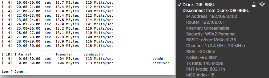 For curiosity sake, I did a 2.4Ghz test. The result is still impressive at 113Mbit/s. However, I recommend everyone to use the 5Ghz whenever possible as the 5Ghz band is much faster and less congested. You will enjoy much better performance and stability on the 5Ghz band.