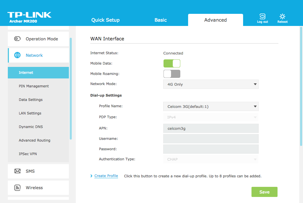 I love the firmware on the MR200, it is a simple device to operate. It will guide you through a step-by-step guide to set up internet connection once you insert your SIM card and turn on the device. You do not need to manually configure the LTE profile as the router will sort everything out itself. You just need to set up the name and password of the new wireless network and you are good to go. I tested it with Celcom and Digi and it detects them automatically without having me to key in manually.