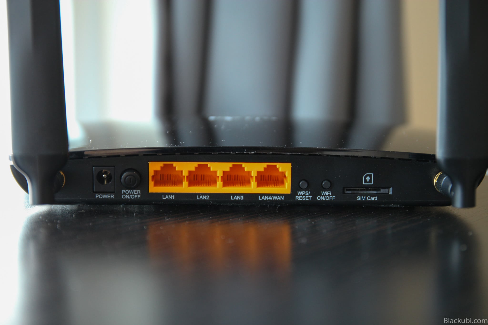 The design of the device is really simple. The entire device is black in colour and the paint is really glossy. On the back, it has  2 removable LTE antennas. The antennas are really high quality unlike the one I got from my Huawei E5186. Besides, we have a bunch of Ethernet ports. They are 10/100 and not Gigabit capable. One of the ports is able to function as a WAN port. The SIM slot is situated at the back of the device as well. Moving on, the entire bottom of the device is filled with ventilating holes to cool the device. I like the fact that TP-Link included some MicroSIM and NanoSIM card adapters in the box.