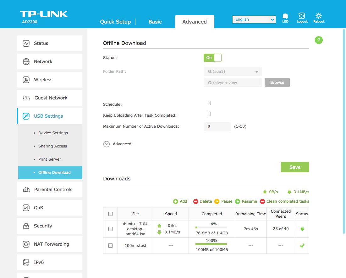 There’s a new feature added to the Talon AD7200. The router now supports downloading files into the USB drive, a feature not available in previous TP-LINK routers. You can configure the router to download files so you do not need to leave your computer powered on. A router can do that task for a significantly lower amount of power than a computer. It will work with usual HTTP link or torrent task. I tested it with Ubuntu official ISO and it works properly at high speed without an issue right out of the box.