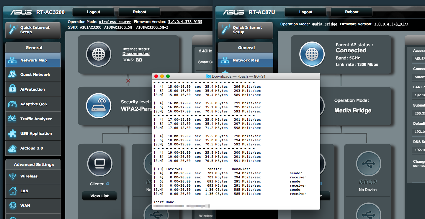For curiosity sake, I performed a quick Media Bridge test on the Asus RT-AC3200. The figures are quite interesting. I am getting 626Mbit/s on the Asus RT-AC68U and 585Mbit/s on the Asus RT-AC87. The wireless on the RT-AC3200 and RT-AC68U are Broadcom based. The overall performance is great on both routers.